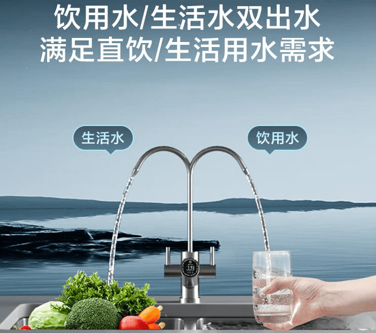 智能方面,这款净水器配备双出水龙头,支持生活水和直饮水切换,实时显示TDS值,操作便捷。它还能监控滤芯状态,自动提醒更换,确保每一滴水都干净卫生。零陈水技术和自动冲洗功能,有效避免水质二次污染,提升使用体验。